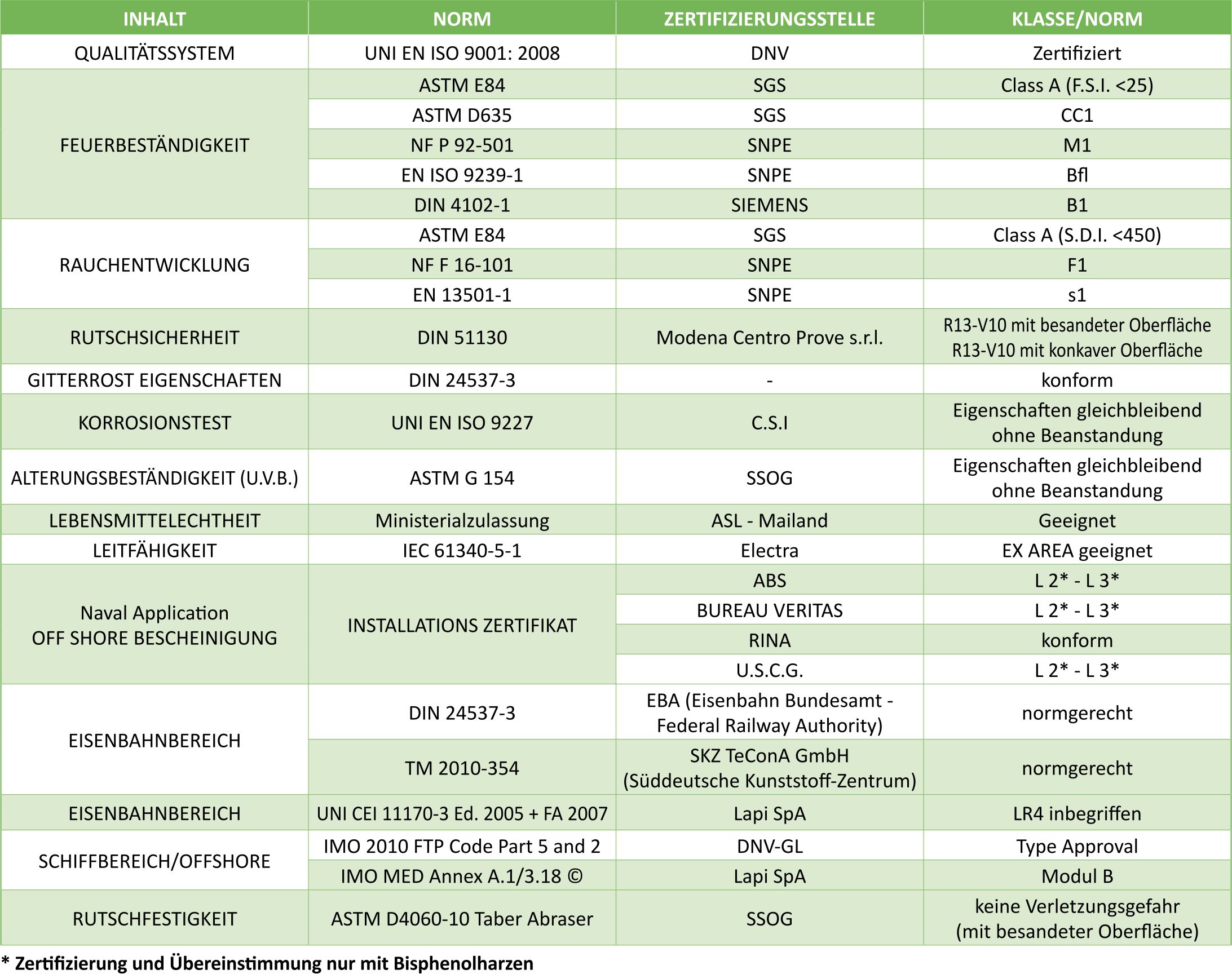 EUROGRATE® GFK Gitterroste sind feuerhemmend nach EN 13501-1 als Bfl-s1 geprüft, der AFNOR NF P 92-501 Norm als M1-M2, nach ASTM E-84 Norm der Klasse (F.S.I. <25) und nach ENEL DS 4974 Norm dem Wert 100.