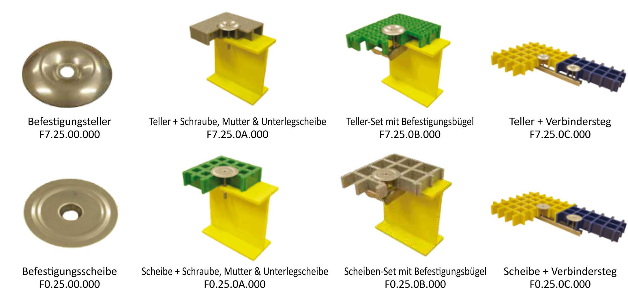 Die Befestigungsscheiben vom Typ "disc" F7.25 dienen der Befestigung von geschlossenen Rosten, Laminatplatten und Stufenabdeckungen. Die Befestigungsscheiben vom Typ "disc" F0.25 dienen der Befestigung von quadratischer Minimasche 8x8, 13x13 mm in verschiedenen Höhen (22, 30, 40 mm) und rechteckiger Maschung 50x25 h 55 mm. Befestigungsscheiben sind mit Schraube & Mutter (A) mit Befestigungsbügel (B) oder Gitterrost-Verbindersteg (C) erhältlich. Alle Komponenten sind in AISI 316 Edelstahl gefertigt .