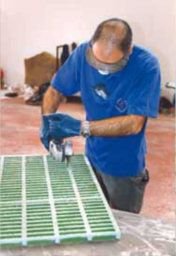 EUROGRATE® FRP gratings are resistant to environmental and chemical corrosion, therefore they don't require sandblasting, painting or coating even after many years of service. If gratings are installed in highly corrosive environments, we suggest to seal cut areas with a protective resin to restore the original chemical resistance and to protect the glass fibers that were exposed after cutting, this prevents possible corrosion attacks or introduction of corrosive agents.