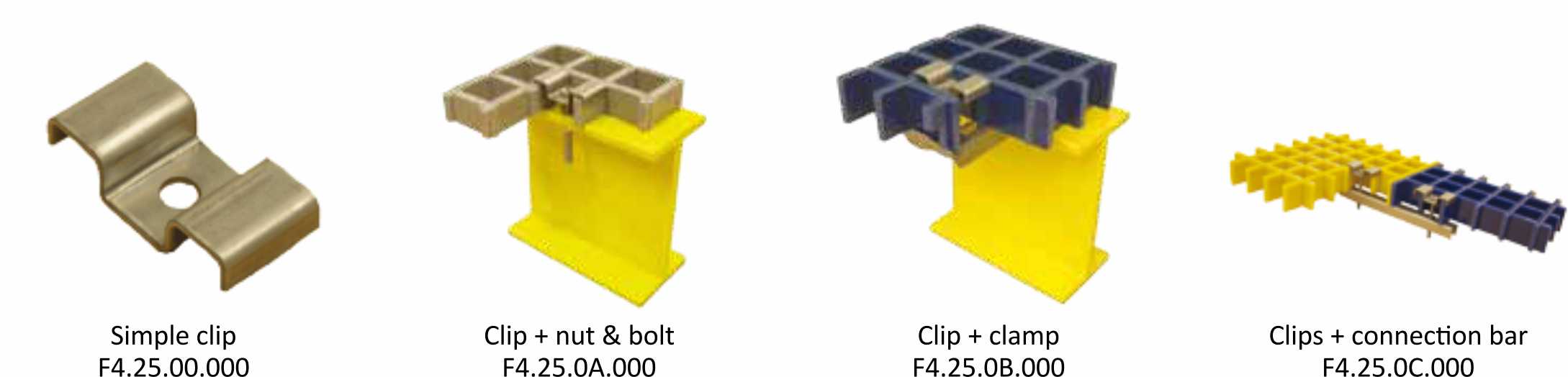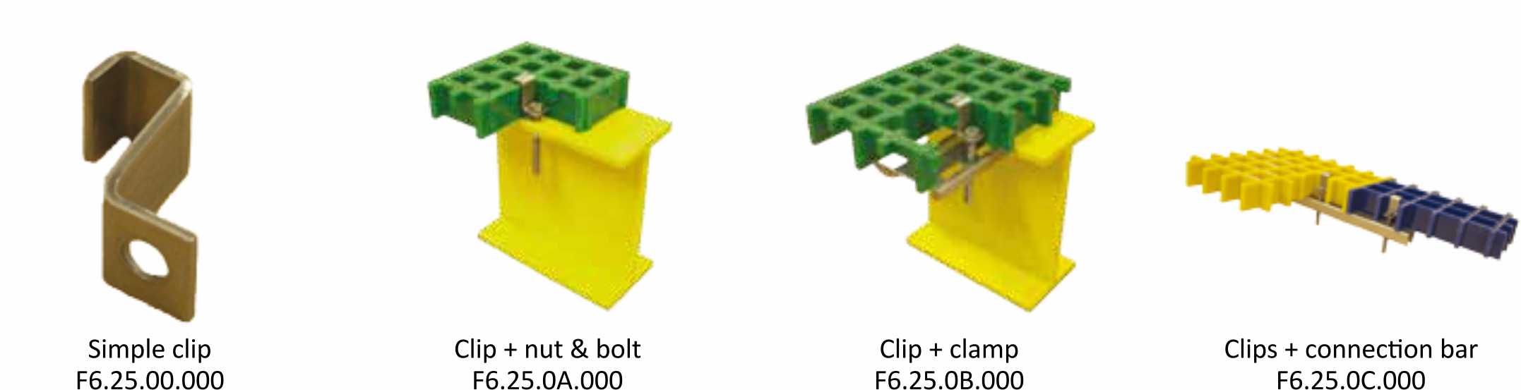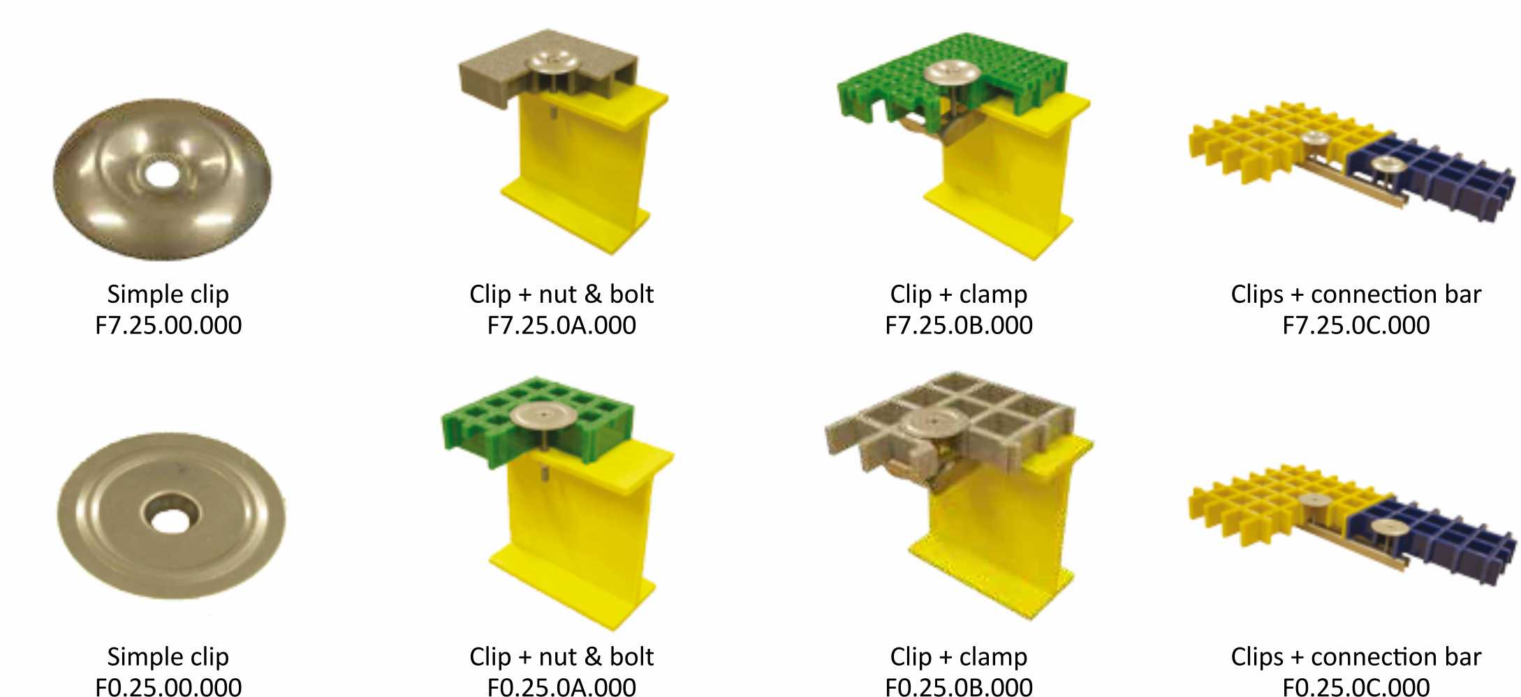 EUROGRATE® FRP gratings must be fixed with special fasteners (minimum 4 fasteners per panel). Closed panels have a natural tendency to warp, therefore we strongly suggest to fix them to the below structure with appropriate fasteners.