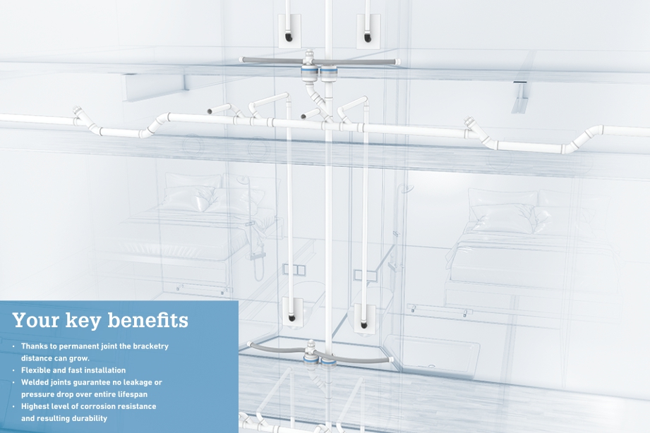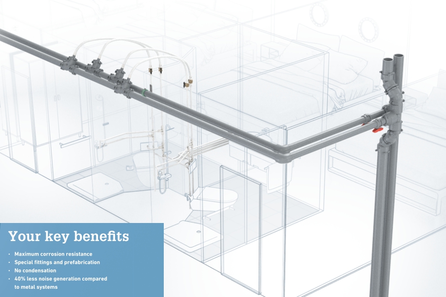 Effective water supply thanks to simple installation technology. Our systems are ideally suited for drinking water distribution on all types of ships. Cabins, kitchens, restaurants and bars are optimally supplied with fresh water. The high flexibility of the material and the easy installation technology cut time and costs to a minimum. The installers have the option to install individual or continuous lines, ring mains, T-piece branches and continuous lines with circulation possible at every deck and in the risers of the vessel.