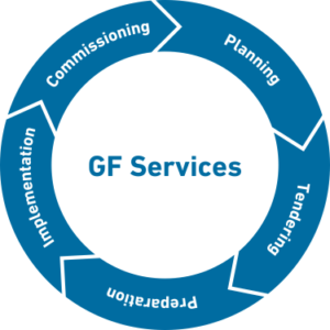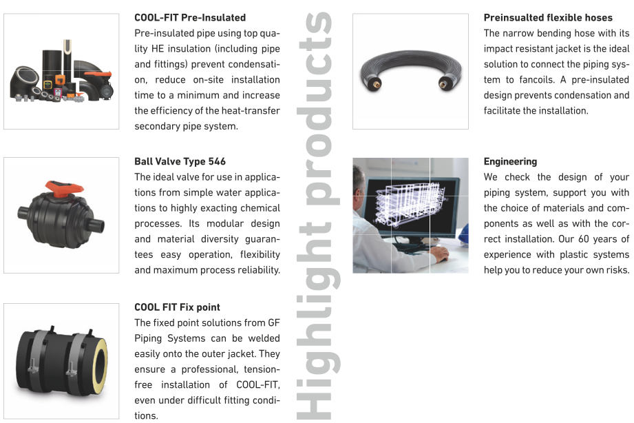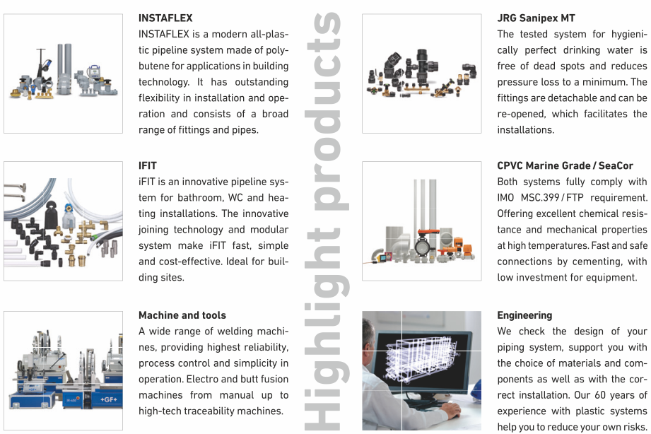 The GF Piping Systems website is a work platform that offers practical assistance for optimum planning, installation, and operation of your system. We provide individual support and application-oriented services along the entire lifecycle of your installation. You can rely on local expert teams, individually tailored training courses as well as on practical online, planning and installation tools. Equipped with the right know-how you can reduce the risk of faulty design and construction work.