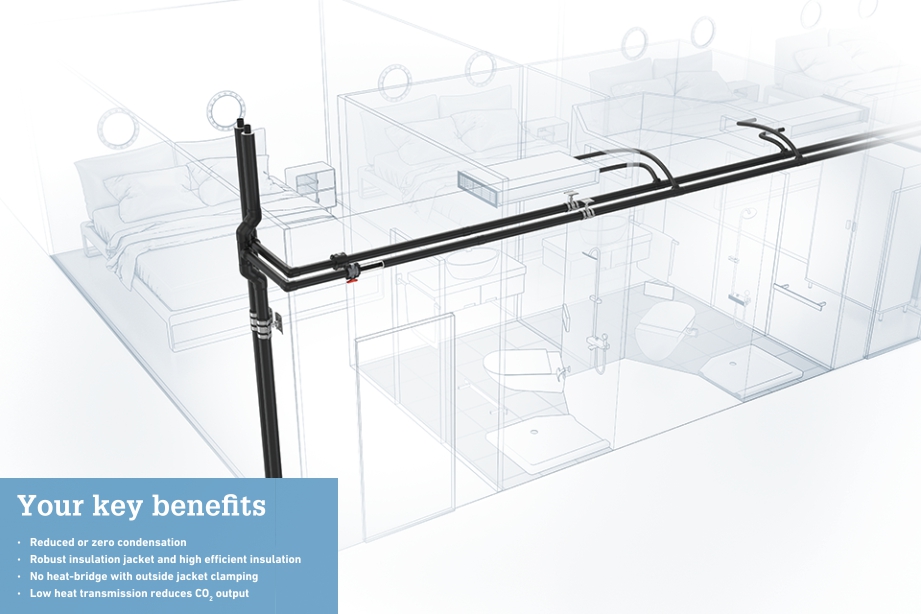 Thanks to the robust external jacket and the highly efficient insulation the system by GF Piping Systems is the right solution for a long service life on board.