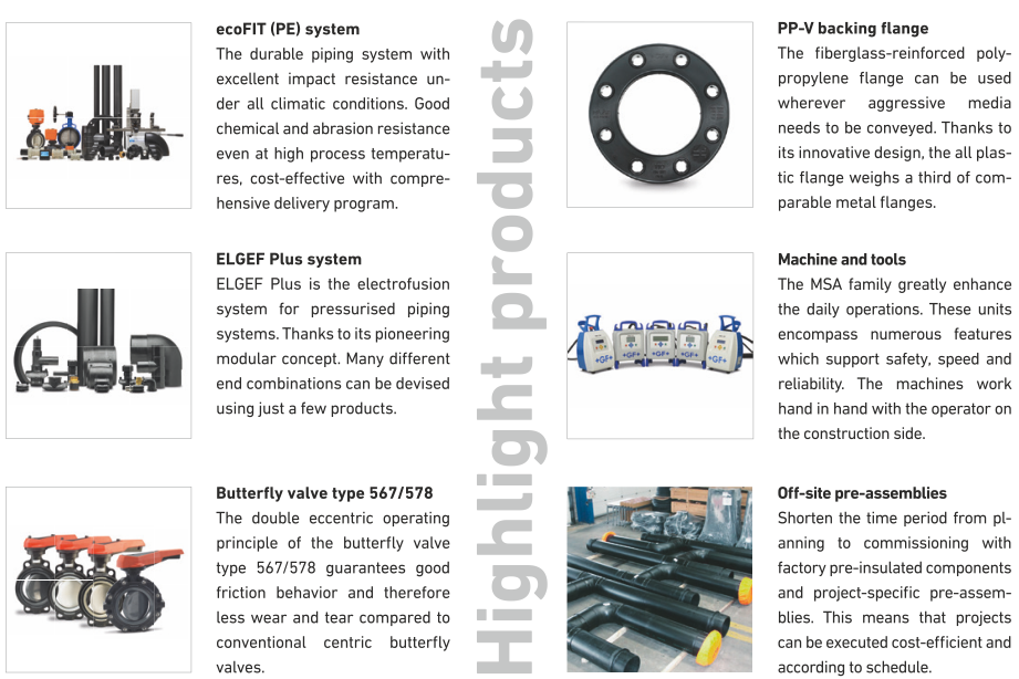 GF Piping Systems is represented in 34 countries with its own sales and production companies and experienced experts. This means that you always have local contact partners that can support you throughout all phases of your project. Our experts know the local requirements and specific features and can recommend you solutions that can be used safely and reliably for the project site. This also applies to projects spanning several countries and continents.